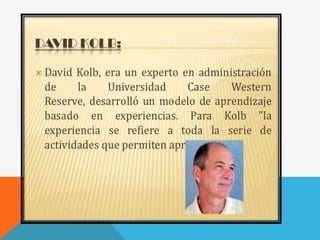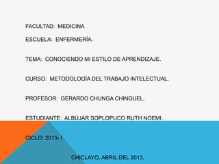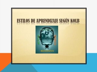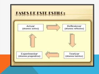 Este documento describe un estudio sobre los estilos de aprendizaje de un estudiante de enfermería. Explica los diferentes tipos de estilos de aprendizaje según Kolb y los resultados de una evaluación que indican que el estilo predominante del estudiante es el reflexivo. Finalmente, concluye que es importante conocer los diferentes estilos de aprendizaje para mejorar el proceso educativo.