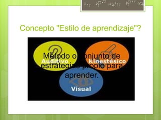Este documento presenta información sobre los estilos de aprendizaje y la psicología del aprendizaje. Explica conceptos como los estilos de aprendizaje, las teorías de inteligencias múltiples de Gardner y los tipos de aprendices según la rueda de Kolb. También analiza factores que influyen en el aprendizaje como la inteligencia emocional y presenta modelos y teorías sobre los estilos de aprendizaje.