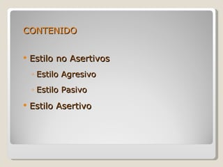 El documento describe cuatro estilos de comunicación: no asertivo, agresivo, pasivo y asertivo. El estilo no asertivo se caracteriza por la falta de control emocional y autoestima baja. El estilo agresivo incluye lenguaje abusivo y amenazas, causando contraagresión. El estilo pasivo es indirecto y evasivo, lo que lleva a dependencia y baja autoestima. El estilo asertivo es efectivo, escucha a los demás, y expresa sentimientos y deseos de manera directa y cooperativa.