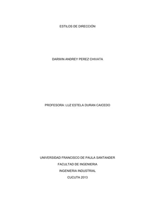 El documento describe seis estilos de dirección en una empresa u organización: autoritario, paternalista, laissez faire, democrático, burocrático e institucional. Cada estilo se caracteriza por el nivel de autoridad del jefe y participación de los empleados en la toma de decisiones. El estilo democrático mantiene un equilibrio entre ambos y contribuye a crear un buen clima laboral, aunque no siempre es el más eficiente.