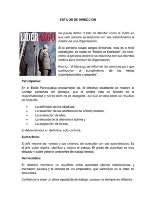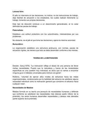Este documento describe varias teorías de la motivación y establecimiento de metas. Define diferentes estilos de dirección como participativo, autocrático, democrático y laissez-faire. También describe las jerarquías de necesidades de Maslow y McClelland, así como las teorías de los dos factores de Herzberg, equidad de Adams, expectativas de Vroom y reforzamiento de Skinner. Finalmente, resume la teoría de Locke sobre el establecimiento de metas y sus funciones.