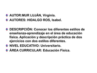 Este documento presenta información sobre diferentes estilos de enseñanza en educación física. Describe dos actividades, el pentasalto de parado y el lanzamiento con frisbee, y cómo se aplicarían los estilos de Mando Directo y Enseñanza Recíproca para desarrollarlas. Con el Mando Directo, el profesor explica detalladamente la técnica a seguir y supervisa su ejecución individual. Con la Enseñanza Recíproca, los estudiantes interactúan más entre sí para aprender la técnica.