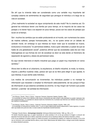 El documento discute las perspectivas y problemas que plantea una sociedad totalmente industrializada para el ser humano desde una perspectiva antropológica. Se argumenta que el hombre es un ser social que necesita vivir en una sociedad equilibrada para estar psicológicamente sano. También se discute cómo la sociedad ha cambiado, con menos familias tradicionales y más diversidad, y cómo esto afecta al diseño industrial y la cultura de los pueblos.