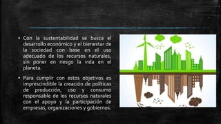 El documento habla sobre estilos de vida responsables y sustentabilidad. Señala que la sustentabilidad busca el desarrollo económico y bienestar social a través del uso adecuado de recursos naturales sin poner en riesgo la vida en el planeta. También menciona que se deben crear políticas de producción, uso y consumo responsable con apoyo de empresas, organizaciones y gobiernos, y establecer objetivos como cuidar normas ambientales, no consumir de más, reutilizar materiales y reciclar. Además, destaca