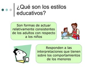 El documento describe cuatro estilos educativos principales: autoritario, sobreprotector, democrático e indiferente. El estilo autoritario se caracteriza por normas estrictas y falta de diálogo, lo que puede causar baja autoestima e inseguridad en los hijos. El estilo sobreprotector no establece límites y hace que los hijos sean egocéntricos y dependientes. El estilo democrático fomenta la comunicación, la responsabilidad y la independencia de los hijos. El estilo indiferente carece de normas y a