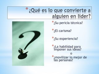El documento explora diferentes estilos de liderazgo y sus fortalezas y debilidades. Algunos estilos como el visionario y el capacitador pueden tener un impacto positivo al inspirar a los demás y delegar responsabilidades, mientras que estilos como el timonel y el coercitivo pueden resultar demasiado autoritarios. El estilo más efectivo depende de las necesidades de la situación.