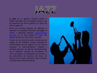 El documento presenta definiciones breves de varios géneros musicales como el jazz, el rock, el funk, el blues, el reggae, el electro y el death metal. Explica sus orígenes y características musicales clave como el énfasis en percusión, bajo eléctrico, ritmos programados o voces guturales.