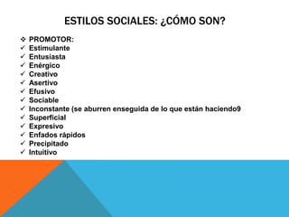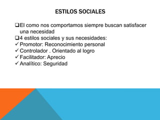 El documento describe cuatro estilos sociales (promotor, controlador, facilitador y analítico) y sus características principales. Los promotores buscan reconocimiento y son estimulantes pero inconstantes; los controladores, orientados al logro, son decididos pero también impacientes; los facilitadores aprecian la armonía y son amistosos pero lentos; y los analíticos valoran la seguridad y son precisos pero también rígidos.