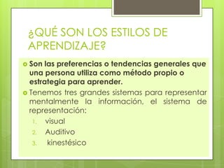 Los estilos de aprendizaje son preferencias que utilizan las personas para aprender, categorizados en tres sistemas: visual, auditivo y kinestésico. Los alumnos visuales obtienen mejores resultados al leer o ver información, los auditivos prefieren escuchar y hablar sobre el contenido, mientras que los kinestésicos aprenden mejor mediante actividades físicas y experiencias prácticas. Cada estilo tiene su propio ritmo y método, afectando la manera en que las personas procesan y retienen información.