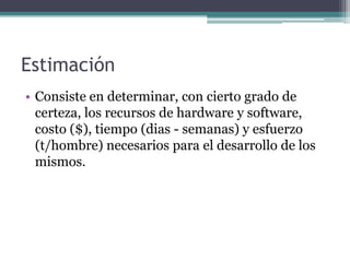Este documento describe el modelo COCOMO II para la estimación de proyectos de software. Explica que COCOMO II proporciona una familia de modelos de estimación de costos de software que van desde menos detallados a más detallados a medida que avanza el proyecto. El submodelo más detallado es el modelo post-arquitectura, el cual utiliza factores multiplicadores y de escala para ajustar el esfuerzo nominal estimado basado en el tamaño del proyecto.