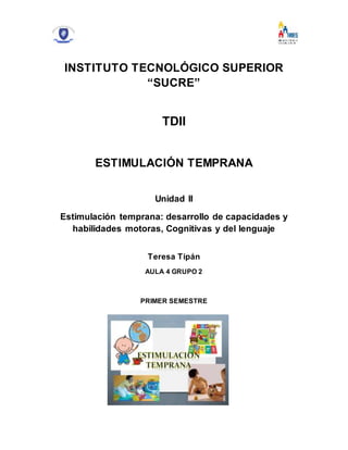Este documento describe la importancia de la estimulación temprana en el desarrollo del niño desde el embarazo hasta los primeros años de vida. Explica que la estimulación prenatal ayuda al feto a desarrollar habilidades cognitivas y sensoriales. También recomienda actividades como cantar, hablar y masajear el vientre que estimulan al feto. Finalmente, detalla cómo la estimulación del tacto, oído, gusto y otros sentidos es fundamental para el desarrollo del recién nacido y niño pequeño.