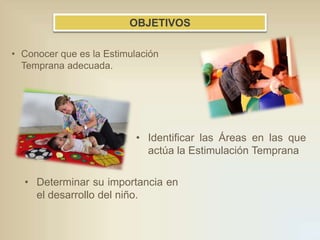 Este documento presenta información sobre estimulación temprana en niños de 0 a 6 años. Explica que el cerebro tiene mayor plasticidad durante esta etapa y que la estimulación temprana es importante para el desarrollo cognitivo, motor, del lenguaje y socioemocional del niño. Se enfoca en cuatro áreas principales y métodos como el juego para aplicar estimulación temprana de manera efectiva.