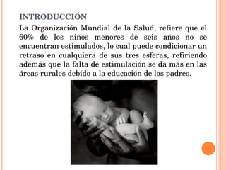 Este documento trata sobre la estimulación temprana en los niños menores de 6 años. Explica que la estimulación temprana es importante para el desarrollo del niño y puede prevenir retrasos. Se define como un conjunto de acciones que potencian las habilidades del niño a través de estímulos adecuados y de complejidad creciente. La estimulación es más efectiva entre el nacimiento y los 3 años debido a la plasticidad cerebral en esas edades.