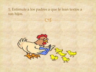 El documento ofrece recomendaciones para promover la lectura en niños. Sugiere estimular a los padres a leerles textos, escoger literatura apropiada para los estudiantes como cuentos infantiles, fábulas, rimas y trabalenguas, y visitar bibliotecas o crear una en el salón de clases.