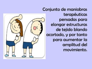 El documento habla sobre los diferentes tipos de estiramiento, incluyendo estiramiento estático, dinámico, pasivo y la técnica FNP. Explica que los estiramientos son maniobras terapéuticas para elongar tejidos blandos acortados y aumentar el rango de movimiento. Algunos tipos comunes son el estiramiento estático, dinámico y pasivo aplicado por un compañero o fisioterapeuta. La técnica FNP utiliza contracciones isométricas antes del estiramiento para obtener