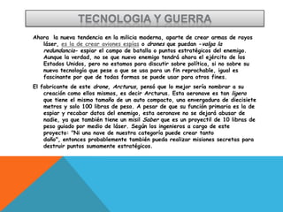 1) Se describe un nuevo drone espía llamado Arcturus que es ligero, rápido y puede espiar o destruir objetivos estratégicos.