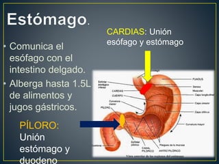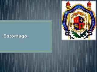 El estómago es un órgano hueco muscular que se comunica con el esófago superiormente y el duodeno inferiormente. Consta de cuatro regiones: cardias, cuerpo, fondo y antro pilórico. Su función principal es almacenar, mezclar y descargar los alimentos en el intestino delgado.