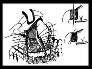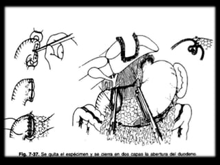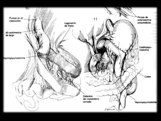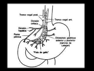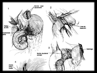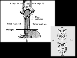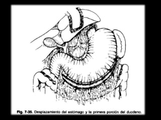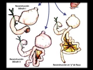 El documento describe la anatomía del estómago, su riego sanguíneo, drenaje linfático e inervación. También describe varias cirugías gástricas y derivaciones como la gastroyeyunostomía, gastrectomía subtotal, vagotomías y piloroplastías. Explica los procedimientos de Billroth I, Billroth II, Heineke-Mikulicz y otros con detalles de sus técnicas quirúrgicas.