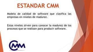El documento describe el modelo de madurez CMM (Capability Maturity Model), el cual clasifica a las empresas de software en 5 niveles de madurez en sus procesos de desarrollo de software. Explica cada uno de los 5 niveles - Inicial, Repetible, Definido, Gestionado y Optimizado - así como los procesos clave que deben implementarse en cada nivel para alcanzar mayor madurez.