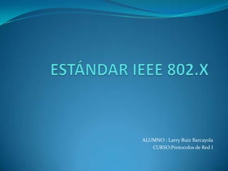 El documento describe los estándares IEEE 802 para redes de área local. Explica que el proyecto IEEE 802 fue creado en 1980 para desarrollar estándares que permitieran a tecnologías de diferentes fabricantes trabajar juntas. Describe varios estándares IEEE 802 específicos, incluyendo 802.3 (Ethernet), 802.11 (Wi-Fi), y 802.15 (Bluetooth).