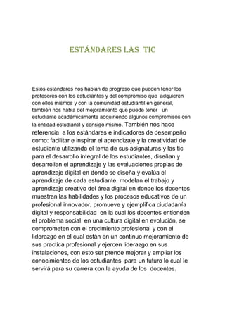 Este documento habla sobre los estándares de las TIC para profesores y cómo pueden mejorar el aprendizaje de los estudiantes. Los estándares se refieren a la facilitación del aprendizaje creativo utilizando las TIC, el diseño de evaluaciones digitales, mostrar habilidades innovadoras, fomentar la ciudadanía digital y comprometerse con el crecimiento profesional. El objetivo final es mejorar los conocimientos de los estudiantes para prepararlos para el futuro.