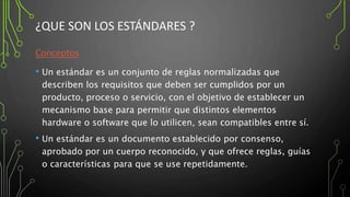 El documento describe el W3C (World Wide Web Consortium), una organización internacional que establece estándares para la World Wide Web. El W3C desarrolla recomendaciones para construir una web accesible, interoperable y eficiente mediante el consenso de sus miembros. Los estándares del W3C incluyen HTML, XHTML y otras tecnologías para mejorar la web y lograr su objetivo de accesibilidad universal.