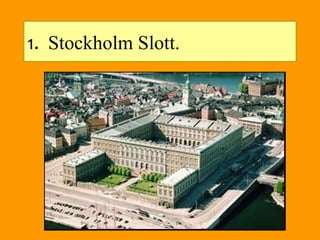 Este documento lista 10 lugares que se pueden visitar en Estocolmo, Suecia, incluyendo el Palacio Real de Estocolmo, Vasamuseet, Skansen, Moderna Museet, Stadshus, Nationalmuseum, la estatua de San Jorge, Gamla Stan y Södermalm. El autor menciona que le gustaron especialmente el Palacio Real de Estocolmo, Nationalmuseum, Stadshus y Gröna Lund.