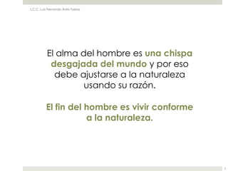 Este documento resume los principios éticos del estoicismo. Enfatiza que el deber humano es vivir de acuerdo con la naturaleza usando la razón, que es parte del espíritu divino. Las virtudes como la libertad, prudencia y templanza conducen a la felicidad a través de la aceptación del destino universal determinado por la razón eterna. El sabio estoico acepta la muerte de manera imperturbable y vive de forma preparada pero no temerosa.