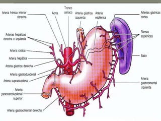 El estómago es un órgano hueco situado entre el esófago y el duodeno. Está dividido en cuatro partes y dos curvaturas. Sus paredes están formadas por la mucosa, submucosa, capa muscular y serosa. Recibe irrigación sanguínea de las arterias gástricas izquierda y derecha, y drena linfa a los ganglios linfáticos gástricos y pancreáticos. Está inervado por el plexo celíaco a través de los nervios vago y simpático.