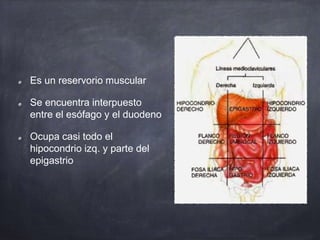 El estómago es un órgano muscular hueco situado entre el esófago y el duodeno. Está dividido en porciones vertical y horizontal, y presenta curvaturas mayor y menor. El estómago tiene relaciones con otros órganos como el hígado, bazo, colon transverso y diafragma.