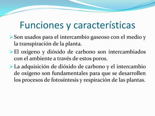 El documento describe los estomas, que son orificios en las hojas de las plantas que permiten el intercambio gaseoso y la transpiración. Explica las funciones y tipos de estomas, incluidos anomocítico, parasítico, anisocítico y otros. También describe el aparato de Golgi, la cromatina y los microfilamentos como componentes celulares importantes.