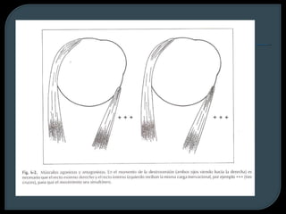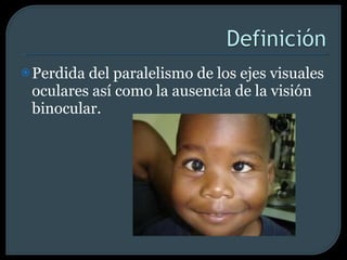 El documento habla sobre el estrabismo ocular, incluyendo sus causas, tipos, síntomas y tratamientos. Describe las pruebas para detectar estrabismos como la inspección ocular, el reflejo corneal y la prueba de oclusión. Explica que los estrabismos pueden ser constantes o intermitentes, congénitos o adquiridos, y que su tratamiento incluye el uso de lentes y en algunos casos la cirugía para corregir los músculos oculares.