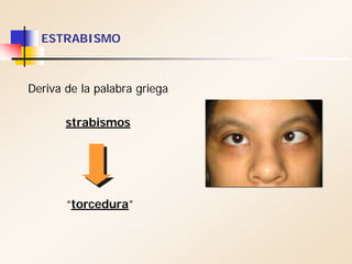El documento define el estrabismo y lo clasifica según varios criterios. El estrabismo es una alineación ocular anormal resultado de la falla en la cadena sensorial-motora del sistema visual. Se clasifica según la dirección de la desviación (esotropia, exotropia), el inicio (congénito, adquirido), la permanencia en el tiempo (intermitente, permanente), y la variación del ángulo en la mirada de lejos y cerca (estrabismo horizontal básico, con alteración de las vergencias).