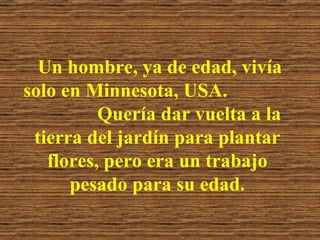 El documento describe la historia de un anciano que quería cavar su jardín para plantar flores pero no podía debido a su edad avanzada. Su hijo, que normalmente le ayudaba, estaba en la cárcel. El anciano le escribió una carta contando su problema. Luego recibió un telegrama de su hijo advirtiéndole que no cavará el jardín porque ahí había enterrado cadáveres. La policía excavó el jardín sin encontrar nada. El hijo luego le explicó que era lo máximo que podía hacer para ayud