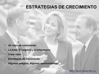 El documento describe el crecimiento de una clínica de cirugía estética a través de varias etapas que incluyeron ampliaciones de capital, la adquisición de un nuevo edificio, y finalmente la venta de la empresa a un grupo líder. Explica conceptos clave como crear valor para los inversores a través del descuento de flujos de efectivo, así como estrategias de crecimiento orgánico y mediante adquisiciones. También analiza fuerzas competitivas y riesgos asociados al crecimiento empresarial.