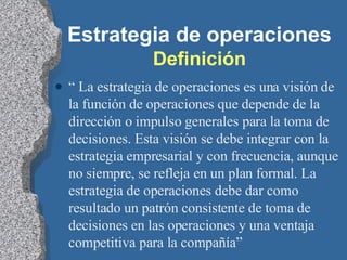 El documento presenta conceptos sobre planificación estratégica de la producción. Explica que la estrategia de operaciones debe integrarse con la estrategia empresarial y reflejarse en un plan formal. También describe modelos para definir la misión, objetivos, políticas y proyectos de producción de acuerdo a las prioridades estratégicas de la empresa. Finalmente, analiza el caso de la compañía Shipper Manufacturing y el desafío de alinear su estrategia de producción con los cambios en la estrategia corporativa.