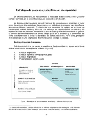 El documento describe cuatro estrategias de procesos para producir bienes y servicios: 1) Enfoque de proceso, 2) Enfoque repetitivo, 3) Enfoque de producto, y 4) Personalización a gran escala. Cada estrategia se distingue por la cantidad y variedad de productos producidos. El documento también incluye ejemplos de compañías como Standard Register, Harley Davidson y Nucor Steel que ilustran estas estrategias.