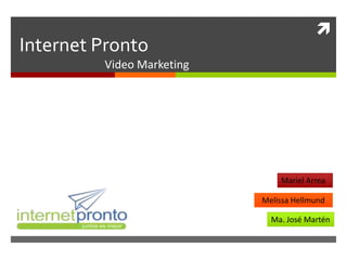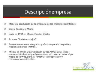Internet Pronto ofrece servicios de mercadeo digital y producción de videos para PYMES. Opera desde 1997 con sedes en San José y Miami, y más de 500 clientes. Su misión es elevar la participación de las PYMES en internet mediante soluciones integradas como correo electrónico, redes sociales, sitios web y video marketing. Este último involucra la creación de canales en YouTube, optimización y publicación de videos para promover la empresa.