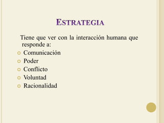 Este documento describe la estrategia y el conflicto. Explica que la estrategia implica la evaluación continua de situaciones y posibles respuestas ante desafíos, considerando los costos y beneficios. La estrategia opera en cinco dimensiones: el conflicto, ámbitos específicos, aspectos internos y externos, y niveles jerárquicos. También describe la dinámica de la interacción internacional entre actores que operan dentro del orden establecido, y los elementos básicos de esta interacción: principios, intereses e actores