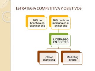 La estrategia competitiva se basa en el liderazgo de costes debido a que la compañía pertenece a un mayorista y puede ofrecer precios más bajos. Los objetivos principales son obtener el 10% de cuota de mercado y un 20% de beneficios en el primer año. Se implementarán campañas de street marketing y marketing directo para alcanzar la cuota de mercado objetivo.