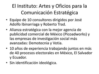 El documento presenta estrategias de comunicación política para campañas electorales, destacando la importancia de entender el ánimo de los electores y construir confianza entre diferentes actores. Se enfatiza la necesidad de una planificación estratégica que incluya la identificación de la identidad del candidato y la definición de objetivos claros, así como la ejecución eficiente de la campaña mediante la comunicación adecuada. Las decisiones de los electores están influenciadas por sus intereses personales y la credibilidad de la campaña, lo que exige un enfoque en la autenticidad y la congruencia en los mensajes.