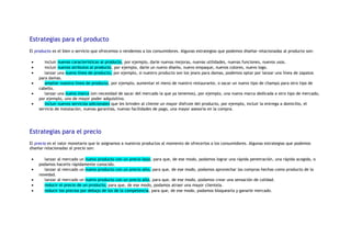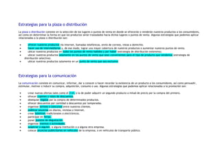 El documento describe varias estrategias relacionadas al producto, precio, plaza y comunicación. Para el producto, se mencionan incluir nuevas características, atributos, líneas o servicios. Para el precio, se proponen lanzar nuevos productos a bajo o alto precio, o reducir precios. Para la plaza, se sugieren canales como internet, intermediarios y tipos de distribución. Finalmente, para la comunicación se enumeran ofertas, descuentos, publicidad y eventos.