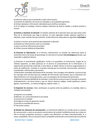 El documento describe diferentes estrategias didácticas referidas al profesor, al alumno y al contenido. Describe estrategias del profesor como preparar el contexto de aprendizaje, informar sobre objetivos, centrar la atención, presentar información y organizar recursos. También describe estrategias de aprendizaje para el alumno como resolución de problemas, auto-instrucción y autogestión. Finalmente, describe estrategias relacionadas al contenido como actividades de introducción, desarrollo y consolidación.