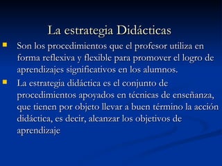 Este documento describe diferentes tipos de estrategias didácticas de enseñanza. Explica que las estrategias didácticas son los procedimientos que los profesores usan de forma reflexiva y flexible para promover aprendizajes significativos en los estudiantes. Distingue entre estrategias didácticas tradicionales, que son expositivas e individualistas, y estrategias constructivas, que son participativas, cuestionadoras y enfocadas en aplicaciones reales. También señala que las estrategias deben adaptarse a cada tema, nivel y entorno