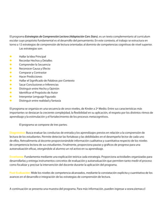 El programa 'estrategias de comprensión lectora' se centra en desarrollar competencias cognitivas a través de 12 estrategias que incluyen el reconocimiento de ideas principales y la identificación de causa y efecto. Está estructurado en once niveles, abarcando desde kinder hasta 2.º medio, y proporciona diagnósticos, actividades de enseñanza y post-evaluaciones para medir el progreso de los estudiantes en la comprensión lectora. Además, se promueve la intervención docente y la autoevaluación activa por parte del alumno.