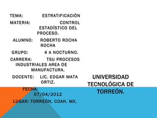 Este documento describe la estratificación como una técnica para dividir datos en categorías para facilitar el análisis y la solución de problemas. Explica que al separar los datos en partes más pequeñas, es más fácil identificar la causa de un problema. También proporciona instrucciones sobre cómo implementar la estratificación mediante la clasificación de datos, la generación de gráficas y el análisis de las diferencias entre los grupos estratificados y los datos totales.