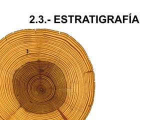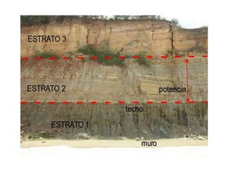 Este documento describe los principios básicos de la estratigrafía. Explica que un estrato es una capa de sedimentos acumulados de forma continua durante un período de tiempo. Luego describe siete principios clave de la estratigrafía: 1) el principio del actualismo, 2) el principio de horizontalidad original, 3) el principio de superposición de estratos, 4) el principio de continuidad lateral, 5) el principio de sucesión faunística, 6) el principio de relaciones cruzadas, y 7) el principio