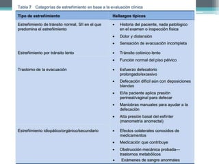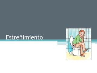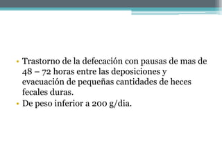 El estreñimiento se define como deposiciones de menos de 3 por semana y dificultad para evacuar. Puede deberse a causas estructurales como obstrucciones o enfermedades, causas sistémicas como problemas endocrinos o neurológicos, o el uso de medicamentos. Los síntomas incluyen deposiciones duras y pequeñas, dolor abdominal y estreñimiento crónico. La evaluación incluye el historial médico, exámen físico y clasificar el estreñimiento en primario o secundario a otras causas.