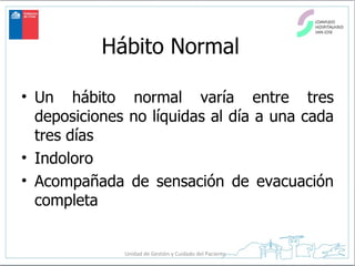 El estreñimiento se produce cuando hay retraso o dificultad en la emisión de heces, y un hábito normal varía entre tres deposiciones al día a una cada tres días. Puede deberse a factores como la dieta, la inmovilidad, el uso de medicamentos o problemas de salud. Si no se trata, puede provocar complicaciones como impactación fecal, dolor abdominal, vómitos o fiebre. Para prevenirlo, es importante beber muchos líquidos, comer alimentos ricos en fibra, hacer ejercicio y establecer una rutina para