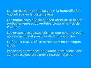 Una estrella de mar con mutaciones fue encontrada en la costa gallega, probablemente debido a los vertidos del Prestige. Los grupos ecologistas afirman que esta mutación podría ser el comienzo de mayores cambios, mientras la estrella permanece en estudio.